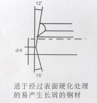 減小槍鉆內(nèi)、外刃角度,即槍鉆內(nèi)外刃磨的更平一些,對(duì)加工斷屑有很大的 幫助。另外,切削線速度的提高,對(duì)斷屑效果也很明顯。加工不易斷屑材料 時(shí),槍鉆端刃可以參考如下角度: