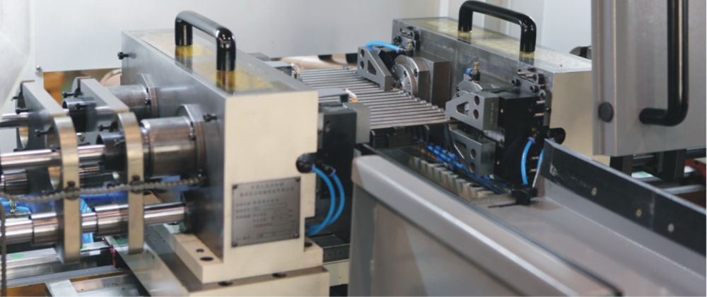 該機(jī)床采用四軸對(duì)進(jìn)式加工,進(jìn)口氣動(dòng)自定心求心夾具裝夾,通過(guò)一次安裝即可完成高精度臺(tái)階孔的加工,并具備極高的入口位置精度。機(jī)床自動(dòng)上料機(jī)構(gòu)單次最大安裝工件數(shù)量為22只,極大縮減了機(jī)床加工的輔助時(shí)間,效率極高。其一個(gè)加工循環(huán)的時(shí)間跨度合理,便于工廠(chǎng)進(jìn)行人員及生產(chǎn)安排,并大幅降低了工人勞動(dòng)強(qiáng)度。