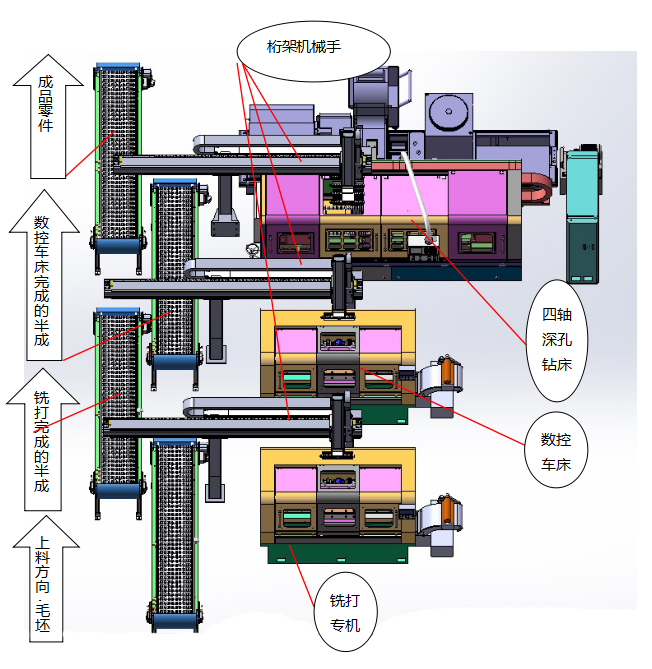 該生產(chǎn)線,將凸輪軸銑打兩端頭專機、數(shù)控車床專機和深孔鉆機床有機結(jié)合,共用一條桁架機械手裝卸工件。成流水線式排列。三道工序組成一個加工模塊,工序間的物流轉(zhuǎn)移都由桁架機械手完成。使凸輪軸粗加工效率發(fā)揮至最大,人工降至最少。提高了加工效率,降低了生產(chǎn)成本。